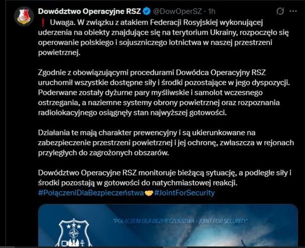 – W związku z atakiem Federacji Rosyjskiej wykonującej uderzenia na obiekty znajdujące się na terytorium Ukrainy, rozpoczęło się operowanie polskiego i sojuszniczego lotnictwa w naszej przestrzeni powietrznej – poinformowało Dowództwo Operacyjne RSZ.