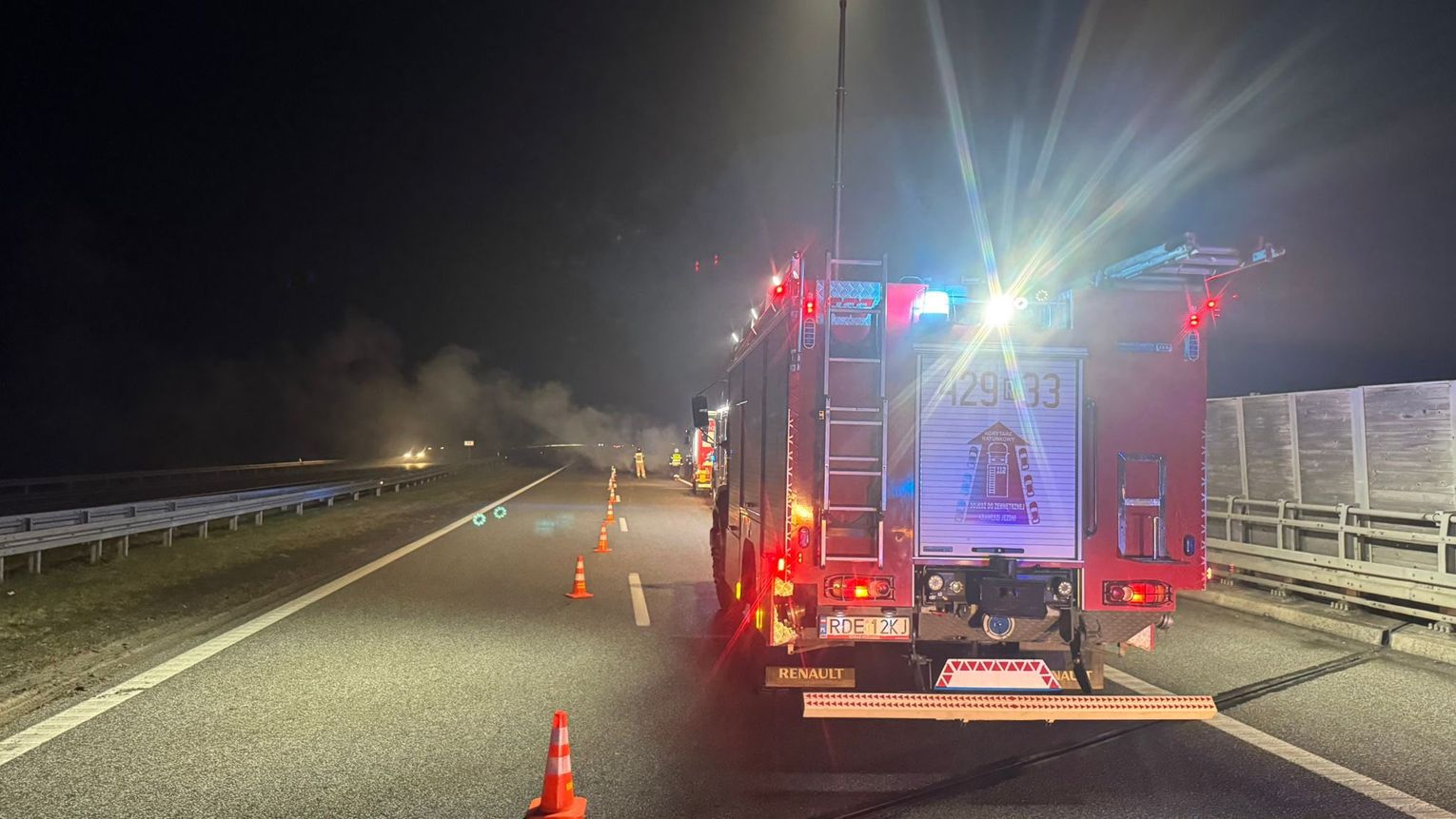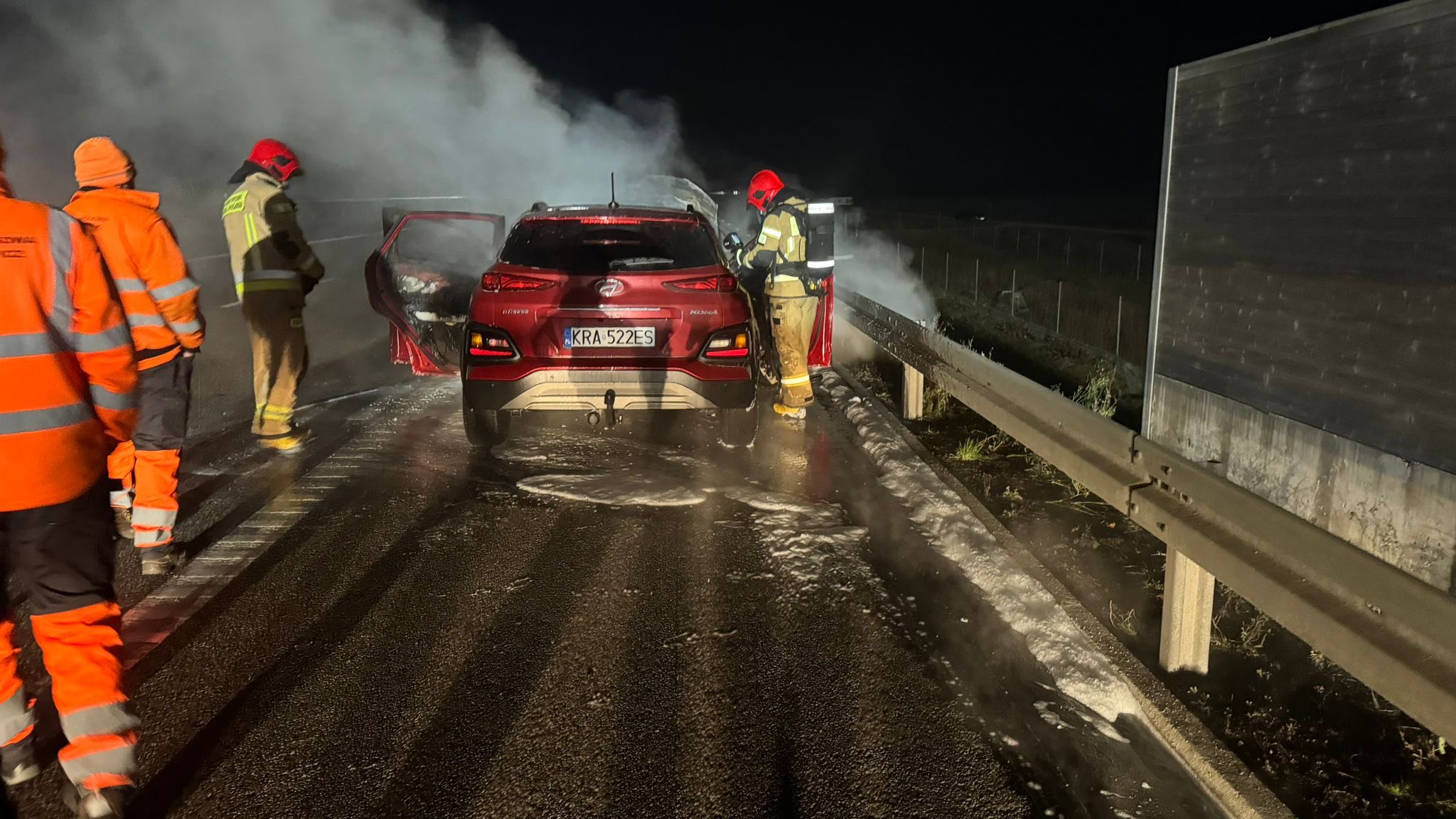 Na miejsce skierowano jednostki Państwowej Straży Pożarnej z JRG 2 Dębica, zastęp Ochotniczej Straży Pożarnej KSRG Żyraków, policję oraz służby zarządzające autostradą. Ogień pojawił się w przedniej części pojazdu – w rejonie komory silnika. Wydobywający się z maski gęsty dym był widoczny z daleka, jednak mimo groźnej sytuacji nikomu nic się nie stało.