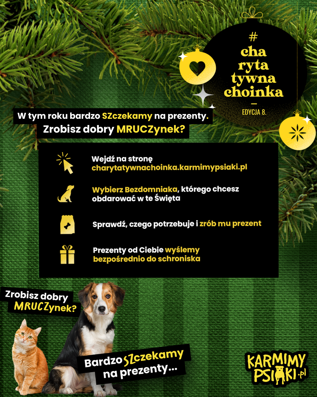 Każdy, kto chce wesprzeć czworonogi, może to zrobić w kilka chwil. Wystarczy wejść na stronę akcji: charytatywnachoinka.karmimypsiaki.pl, wybrać psiaka lub kociaka, a następnie skompletować dla niego prezent online.