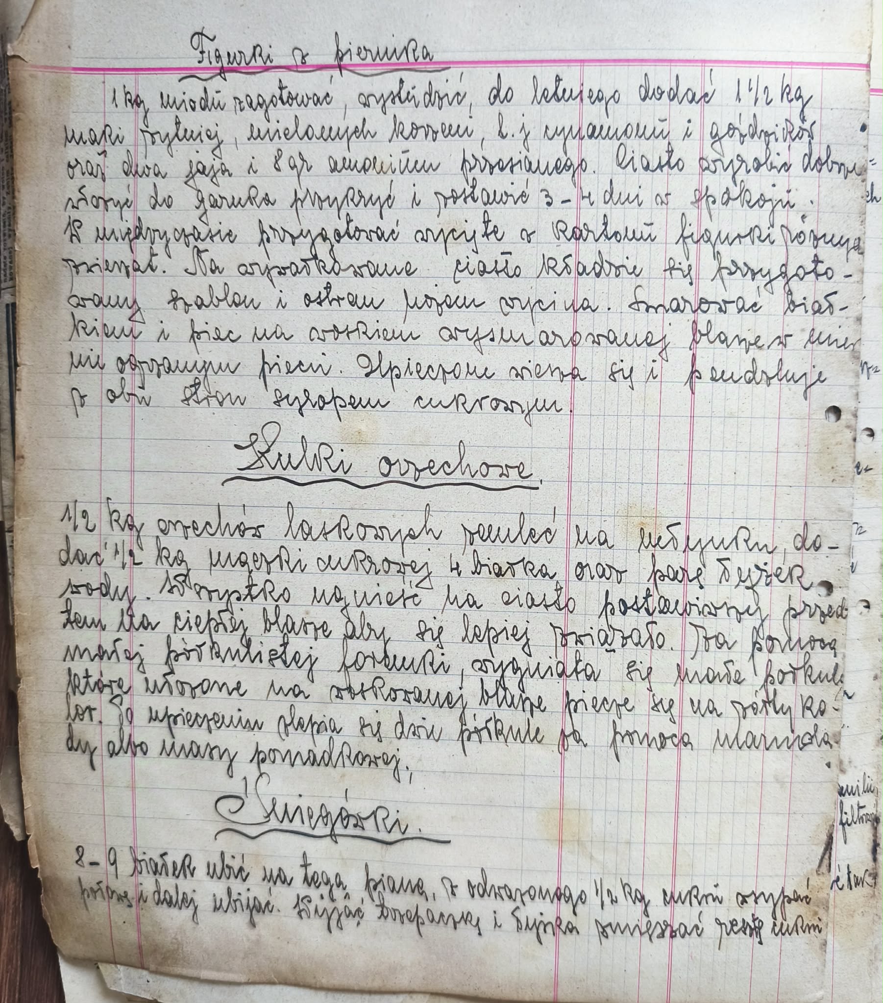 Sposób przygotowania: Miód należało zagotować i wystudzić do stanu „letniego”. Po zagnieceniu z mąką i przyprawami, ciasto trafiało do ceramicznego garnka, gdzie pod przykryciem „odpoczywało w spokoju” przez 3 do 4 dni. Dopiero po tym czasie wycinano z niego figurki przy pomocy kartonowych szablonów. Po upieczeniu prababcia pędzlowała je błyszczącym syropem cukrowym, nadając im niemal lustrzany blask.