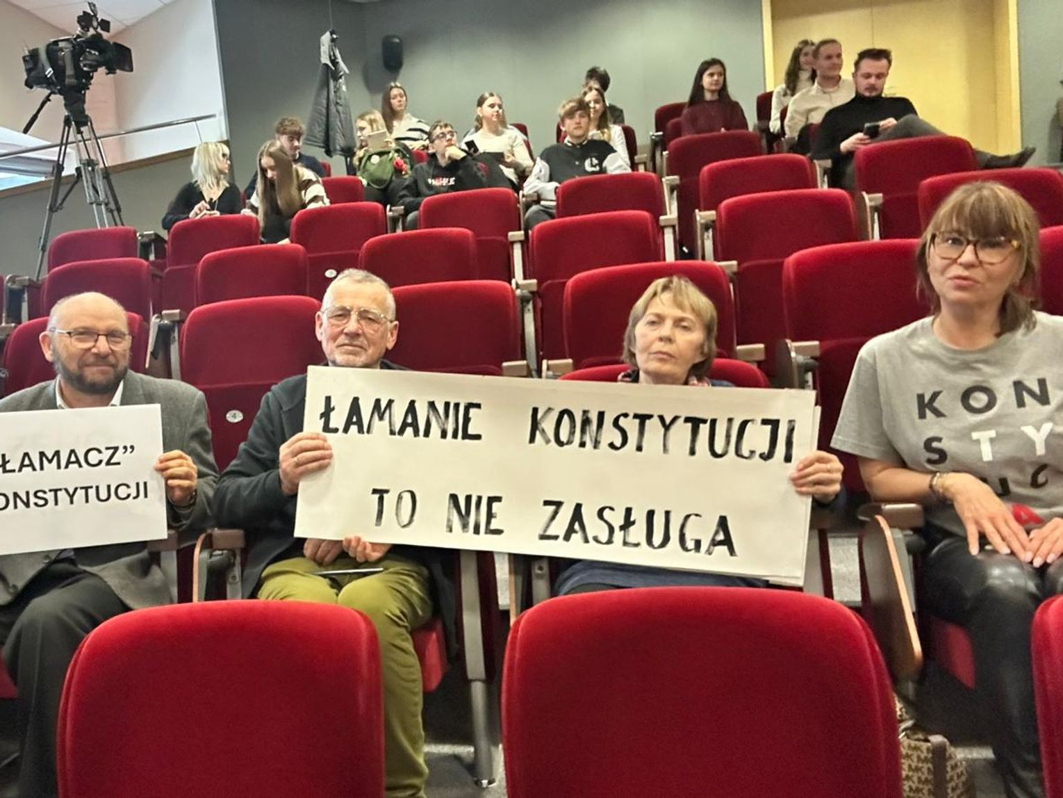 Reprezentująca KOD Joanna Lasko, która zabrała głos w dyskusji, wypunktowała listę zastrzeżeń wobec byłego prezydenta, podkreślając, że nadanie mu odznaki dewaluuje rangę wyróżnienia, którym wcześniej uhonorowano 92 zasłużone osoby i instytucje. Protestujący przynieśli ze sobą transparenty z hasłami: „Zero zasług, zero zasad” oraz „Łamanie Konstytucji, to nie zasługa”, które odbiły się szerokim echem w obecnych na sesji mediach.