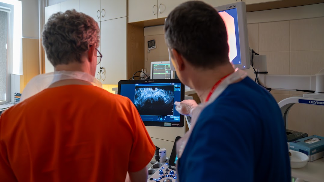 W trakcie wizyty, oprócz wykonywania diagnostycznych i terapeutycznych procedur endosonograficznych, prowadzone są również konsultacje oraz dyskusje dotyczące leczenia pacjentów z chorobami wątroby.