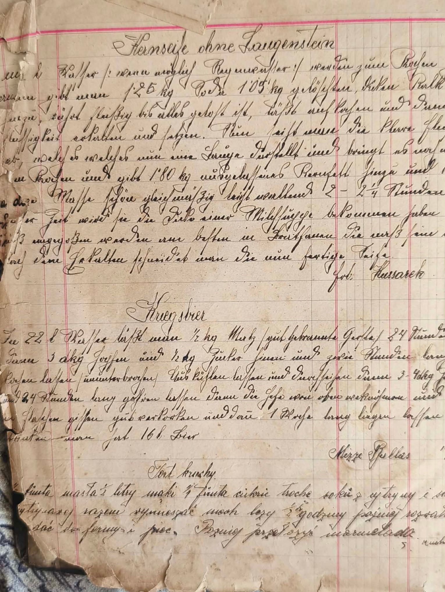 Dwujęzyczność zapisków była więc naturalna. Przepis na Kernseife (mydło rdzeniowe) czy Kriegsbier (piwo wojenne) został sporządzony w języku niemieckim, co może sugerować, że receptury techniczne lub te pochodzące z oficjalnych poradników tamtego czasu były silnie zakorzenione w niemieckiej nomenklaturze. Z kolei sekcja słodkości – Babka, Tort kruchy czy domowe Wino z żyta – zapisana jest piękną, dawną polszczyzną. Zatem ta przeplatanka językowa była typowa dla mieszkańców regionów przygranicznych lub terenów dawnych zaborów, gdzie oficjalna edukacja często odbywała się w jednym języku, a serce domu biło w drugim.
