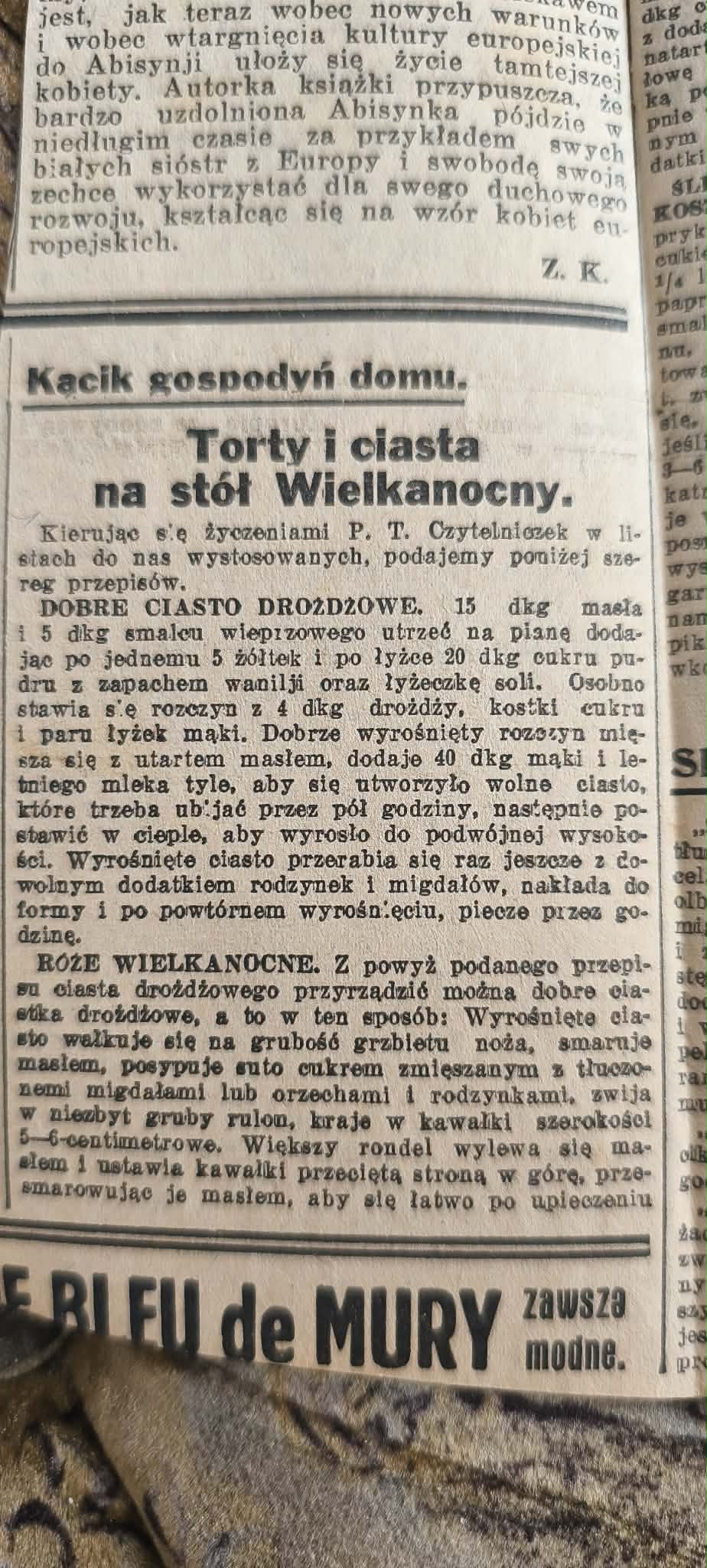Przedwojenne gazety nie zapominały jednak o zbliżających się świętach. W innych wycinkach pojawia się dział dla gospodyń z przepisami na wielkanocne ciasta i torty. Wśród nich znajdziemy receptury na mazurek wielkanocny z bakaliami, sernik świąteczny przygotowywany z kilograma twarogu ucieranego z masłem i żółtkami, a także na różne kruche ciasteczka czy babę piaskową. Gazeta radziła też, jak przygotować dobre ciasto drożdżowe – wyrabiane z masła, żółtek, drożdży i mleka, pozostawiane do wyrośnięcia w cieple, a potem pieczone powoli przez około godzinę.