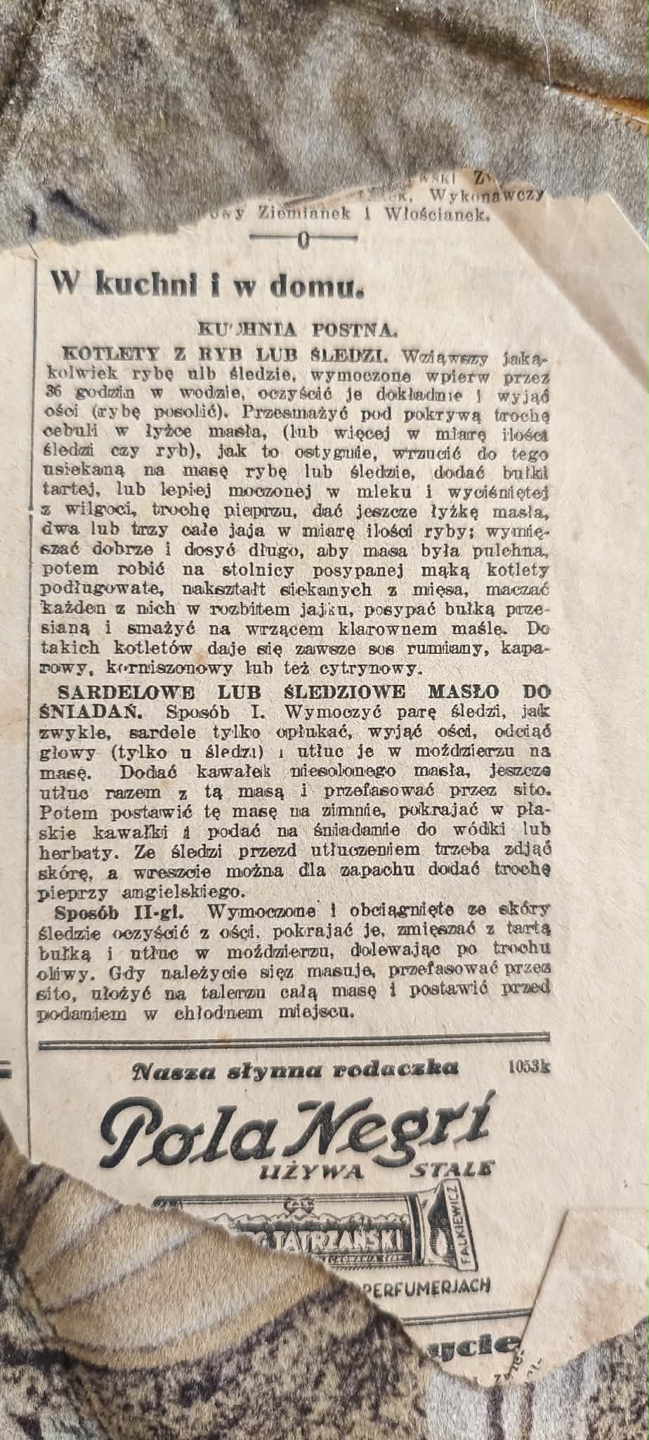Co ciekawe, wśród kulinarnych porad trafia się też fragment zupełnie innego charakteru. W jednym z wycinków gazeta rozpisuje się o słynnej aktorce Pola Negri – przedwojennej gwieździe kina, która zrobiła karierę nie tylko w Polsce, ale i w Hollywood. Taki kontrast jest bardzo charakterystyczny dla dawnych gazet: obok przepisów i porad domowych pojawiały się wiadomości ze świata kultury, mody czy życia towarzyskiego.
