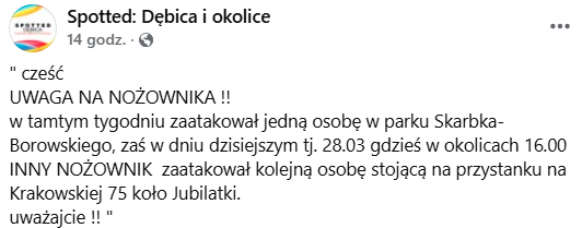 Już wczoraj w przestrzeni mediów społecznościowych pojawił się apel jednego z mieszkańców o zachowanie szczególnej ostrożności. Wskazuje również na wcześniejsze akty przemocy. Nie wiemy natomiast, czy za czynami stoi ten sam agresor.
